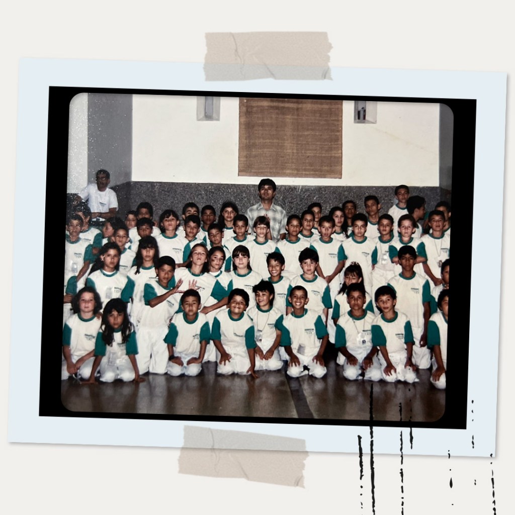 En esa foto aparecemos los 50 niños y niñas con uniforme blanco y verde. Yo estoy en una esquina, arrodillada y mirando a la cámara. Y justo en el otro extremo, aunque no lo conocía, y no tenía ni idea de que nuestros caminos se encontrarían un día, está el hombre que, 20 años después, sería mi esposo.