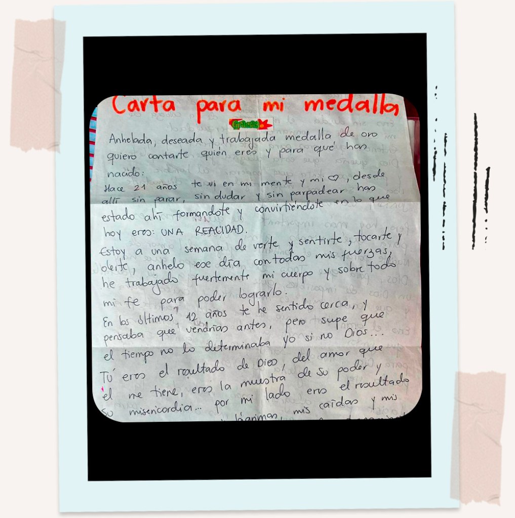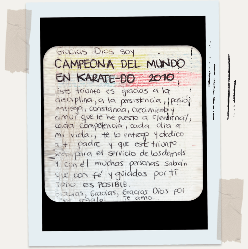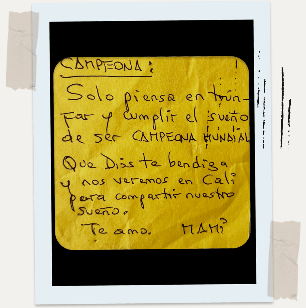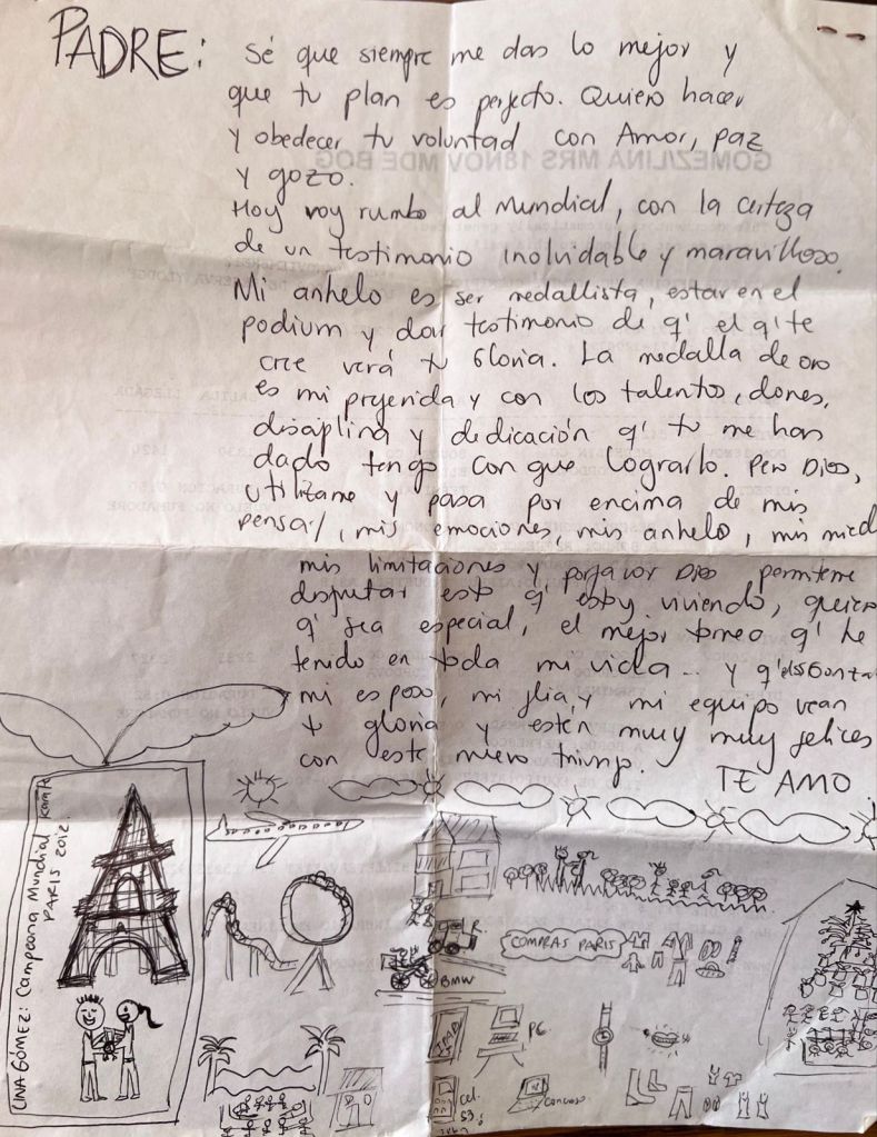 Recuerdo que, en algún momento del viaje hacia París, me senté con Camilo a tomarnos un café en un aeropuerto, tomé la hoja de papel en la que tenía el itinerario y comencé a dibujar la torre Eiffel; junto a la torre me dibujé con Camilo, él me estaba poniendo la medalla de oro como campeona del mundo.